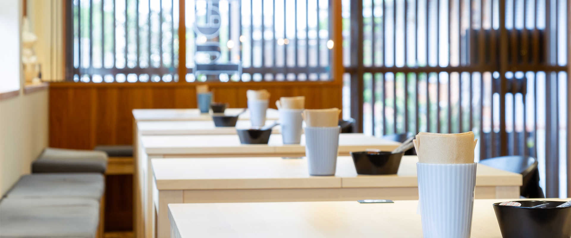 女性専用のお宿「やわらの湯まるや」の1階にあり、開放感のあるガラス張りの店内には、陽の光がやわらかく差し込みます。